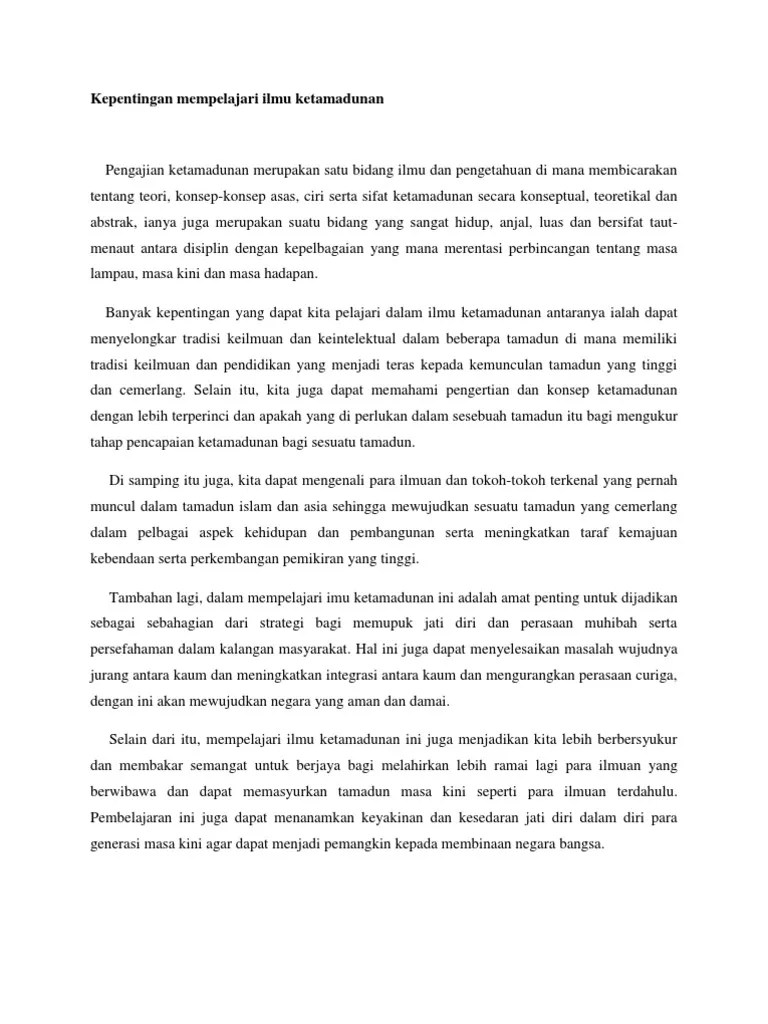 Konsep ketamadunan sepatutnya dilihat dari perspektif yang meliputi pencapaian tatasusila dan moral yang tinggi serta kemajuan penempatan dan kemudahan yang sempurna. Memperkenalkan pengajian ketamadunan di institusi pengajian tinggi bagi pemahaman dan menimbulkan rasa hormat antara kaum di malaysia. Kepentingan mempelajari ilmu ketamadunan pdf. Doc kepentingan ilmu ketamadunan kepada pembangunan negara amir syafiq academia edu. Masyarakat melakukan perkara perkara negetif secara berleluasa.