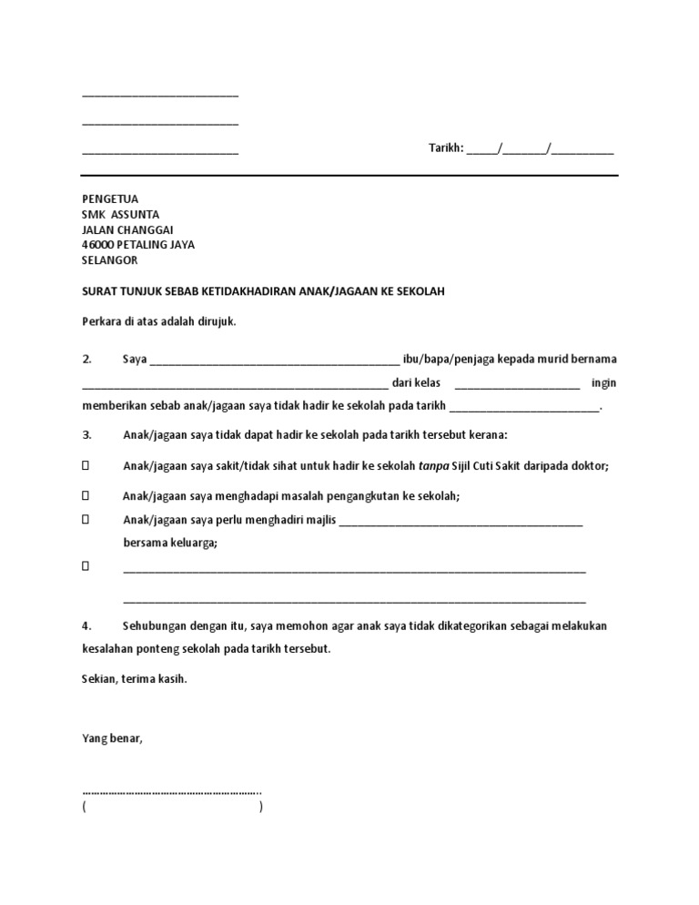 Kerana balik kampung, surat rasmi tidak hadir ke kem, contoh operasi datang lewat ke sekolah via www.slideshare.net. Anak saya tidak dapat hadir ke sekolah pada tarikh berkenaan kerana beliau mengalami sakit perut/sakit kepala/demam kalau contohnya anda pergi buat pemeriksaan anak anda di utc, boleh dapatkan surat cuti sakit, tapi. Surat rasmi tidak hadir ini adalah mustahak bagi memastikan rekod berhenti sekolah pelajar dalam keadaan baik. Kalau tak datang, buat surat kiriman rasmi. Format surat rasmi scribd.html autos weblog via www.autosweblog.com.