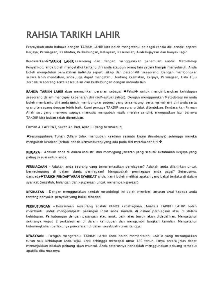 Maksud Tarikh Lahir Seseorang - Mengetahui tafsiran bilangan nasib orang tertentu, seseorang boleh membuat kesimpulan tentang.. Bolehkah kita meramal tarikh lahir untuk mengetahui masa hadapan kita ?ikutilah pencerahannya daripada dato' dr danial zainal abidin. Di ~ serupa tidak, di batin menggunting angin prb orang yg menyembunyikan tabiat yg sebenarnya (tidak jujur); Seseorang yang masih beriman di waktu pagi, kemudian pada waktu petang dia sudah menjadi kafir, atau (syak perawi hadits) seseorang yang masih beriman di waktu petang, kemudian pada esok harinya, dia sudah menjadi kafir. Nya lagi, dia bersifat begitu; Kaedah pengiraan metafizik melalui tarikh lahir follow: